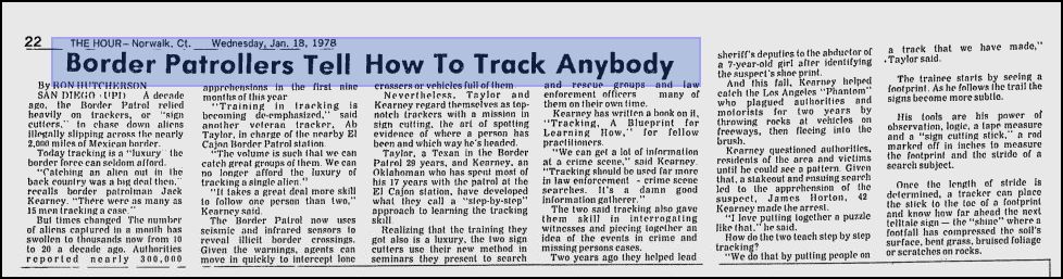 “It generally comes as quite a surprise when people discover that there are still men who practice this ancient art with as much skill and frequency as did the early cowboy and Indian. These men not only track other human beings almost daily, but actually earn their living at it. The United States Border Patrol has been charged with the responsibility of apprehending aliens who try to enter the United States illegally, and the practice of tracking these aliens, of actually following their “sign” through the rugged back country, is a technique that is as old as the Border Patrol itself”