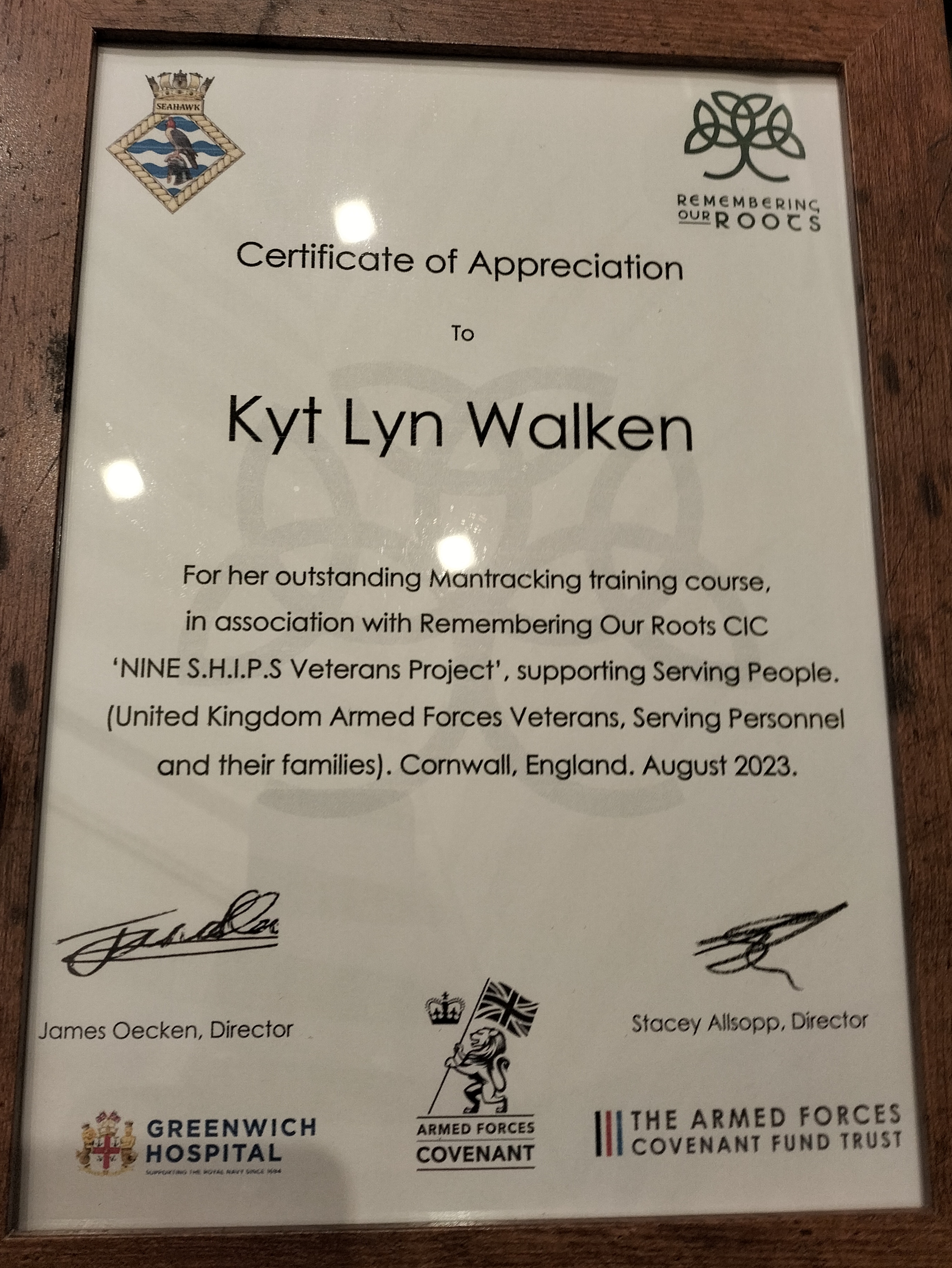 “You are an amazing instructor in your own right, and a credit to “Hull’s Tracking School” Virginia USA. Your style of delivery is awe-inspiring and captured everybody’s attention from the outset. Your enthusiasm for the subject is infectious, your knowledge on mantracking is phenomenal, your skills are undeniable. You demonstrate with sheer conviction, professionalism, a high level moral integrity, extreme sense of duty, empathy and humanity. Your presence here in Cornwall has a had the most profound and long lasting positive effect on all you engaged with. Here’s to you, Ms Walken, may you shine a light on all who are fortunate to meet you.” Stacey Allsopp, Remembering Our Roots CIC, U.K.