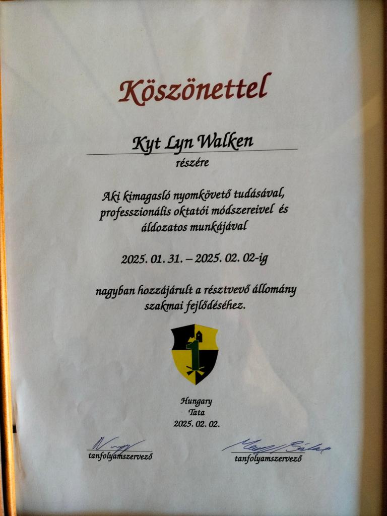 “Last week I completed a highly immersive Mantracking course taught by the legendary Kyt Lyn Walken in Belgium […] I am deeply grateful to Kyt for bringing such passion, professionalism and depth of expertise. Her ability to link theory with tactical and forensic operational practice is remarkable” – Krisztian Zerkowitz, Soldier 11 LMB 20IBB – Belgium