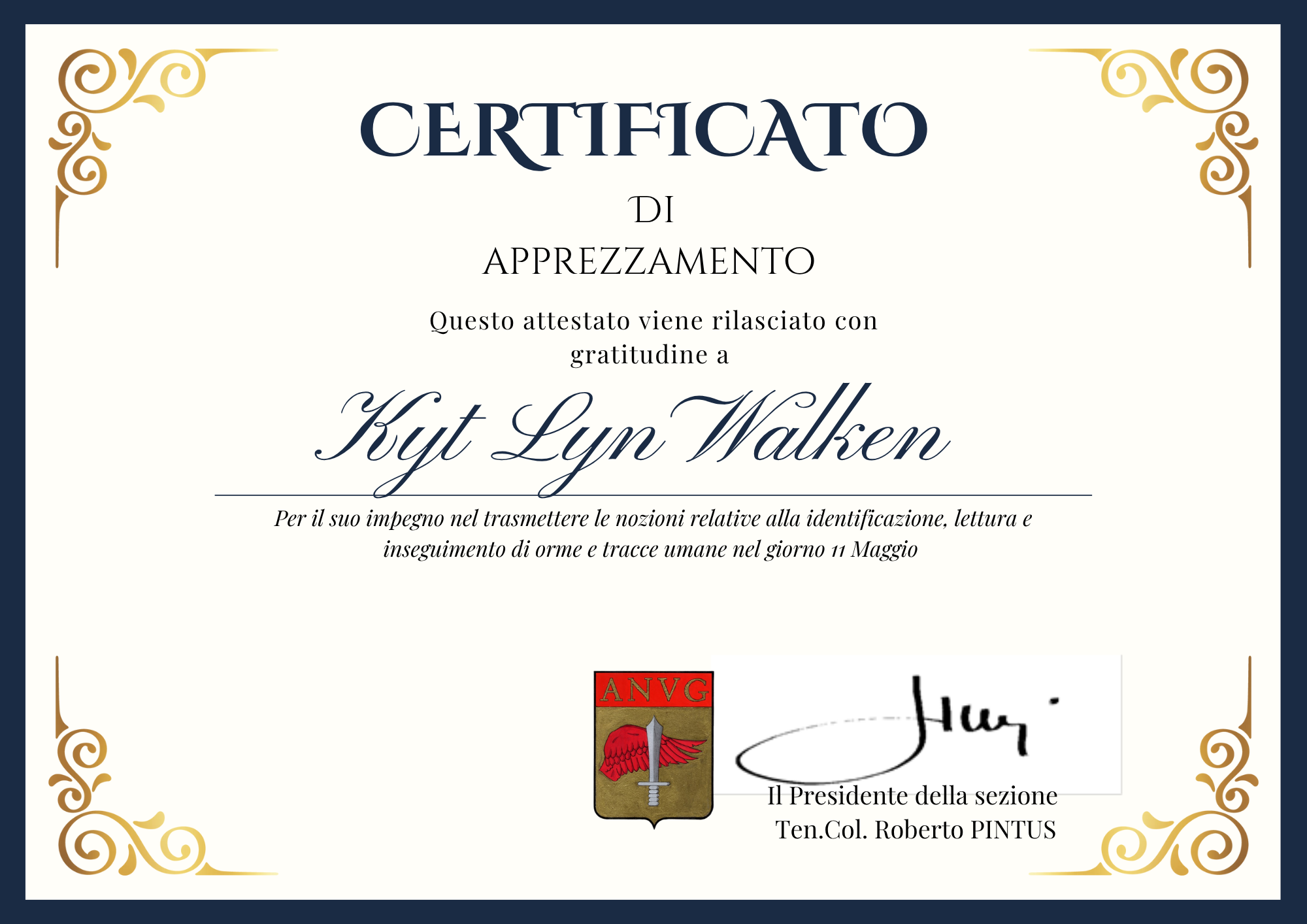 “Always intrigued by this discipline, I decided to attend the Tracking Level 1 course held by Kyt Lyn Walken. I found it wonderful, informative and very interesting; Kyt is truly an instructor capable of transmitting notions and all the passion he has for this discipline. I have already advised colleagues and acquaintances to participate in one of her courses” M.S. OR-4 11°rgt Bersaglieri Esercito Italiano