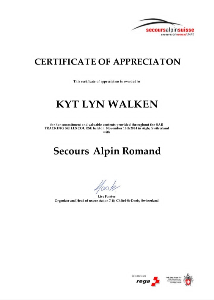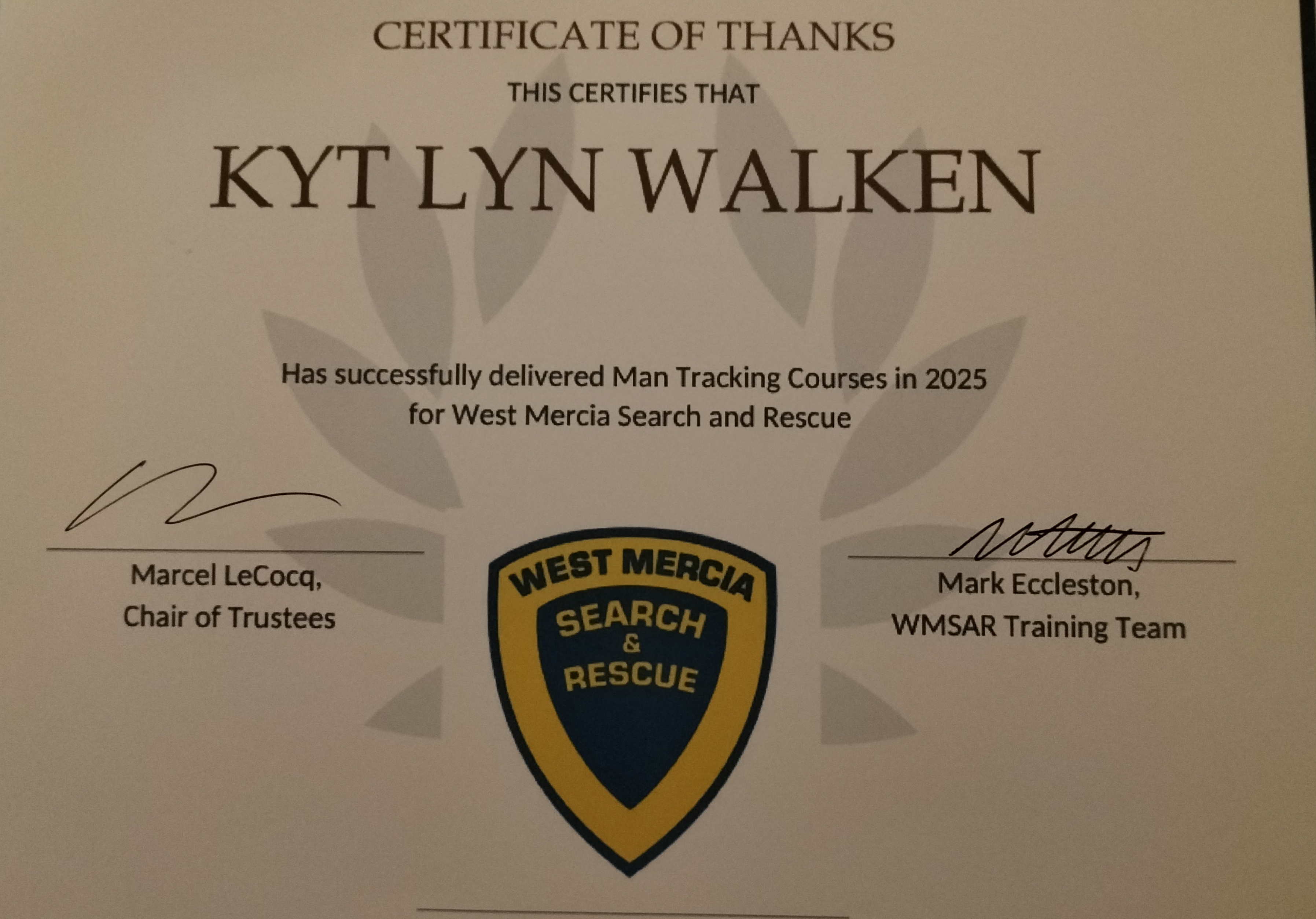 Wir werden auf jeden Fall in 2024 ein weiteres Seminar mit Kyt Lyn durchführen um unsere Fähigkeiten weiter zu verbessern.Kyt Lyn ist eine sehr erfahrene und kompetente Ausbilderin, gerade im SAR-Bereich. Durch die im Rahmen eigener SAR-Einsätze gesammelten Erfahrungen konnte Sie uns sehr weiterhelfen.Wir haben Kyt Lyn sowohl menschlich als auch fachlich sehr schätzen gelernt und können Sie als Trainerin wirklich sehr empfehlen.Bei Fragen steht der Vorstand der Mantracker Germany gerne zur Verfügung.”, Tobias Weller, MANTRACKER Search and Rescue, Deutschland